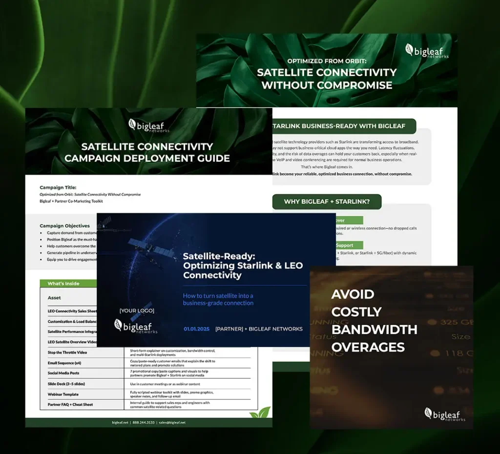 Bigleaf’s Satellite Connectivity Campaign-in-a-Box gives partners everything they need to bring the Bigleaf + Starlink value story to market fast, including: