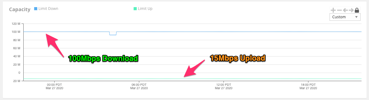 In the capacity graph below, you can see the overall capacity of this home internet connection. The line on top represents download capacity and the line below represents upload capacity.