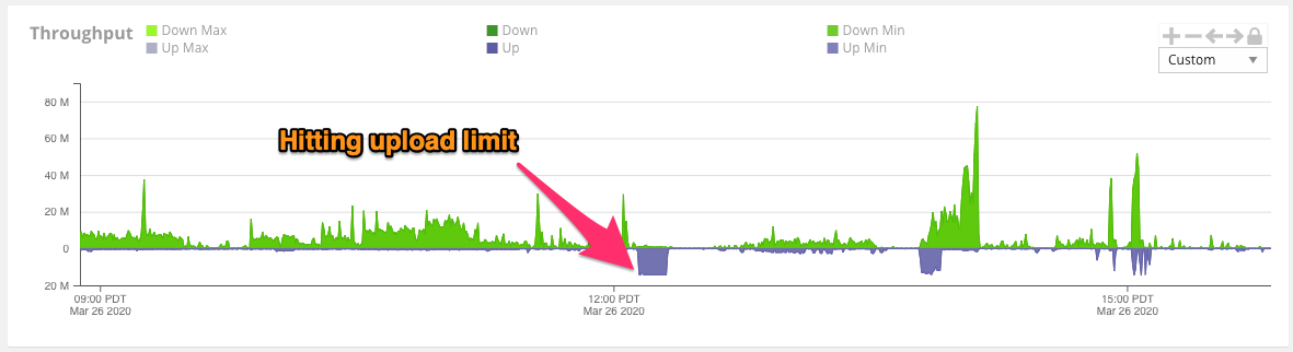 The download throughput never exceeds the 100 Mbps capacity, topping out at around 75 Mbps. However, right after 12:00 noon, something caused a spike in upload traffic that maxed out the upload capacity. That means some traffic couldn’t go through immediately.